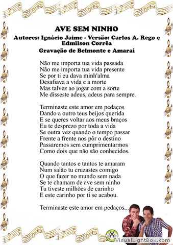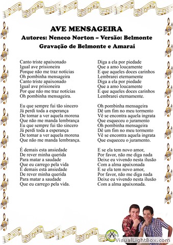 01) Ave Mensageira - Neneco Norton - Versão: Belmonte 02) Ao Te Perder - Kennedy e M. Carr - Versão: Luiz de Castro 03) O Tropeiro - D. P. - Adaptação: Capitão Furtado 04) A Hora do Amor - Pace, K. Reid e G Brooker - Versão: Geraldo Figueiredo 05) Amor Distante - Belmonte e George Ab 06) Ainda Ontem - Bolinha e Carlos Paraná 07) Uma Noite Não - Irene Pintor - Versão: João Borges 08) Velha Canoa - Crisóstomo de Faria e Belmonte 09) Amor de Artista - Tonico e Tinoco 10) A Voz do Amor - Cláudio de Barros e J. Barroso 11) Não Vá Embora - Edmilson Corrêa e Belmonte 12) Eterna Saudade - Belmonte, Amaraí e Marrequinho 13) Boa Noite, Amor - Waldik Soriano e Teddy Vieira 14) Minha Linda Cidade - Tertuliano Amarilha e Victor Gimenez 15) Ave Sem Ninho - Ignácio Jaime - Versão: Carlos Rego e Edmilson Corrêa 16) Saudosa Noiva - Letinho e Nelson de Carvalho 17) Meu Dilema - Amaraí e Bolinha 18) Mercedita - Ramon S. Rios - Versão: Belmonte 19) Os Verdes Campos de Minha Terra - Putman - Versão: Geraldo Figueiredo 20) Meu Conselho - Jorge Paulo e Silveira 21) Grito Aberto - Nico Jimenez - Versão: Belmonte e J. Santana 22) Quero Lhe Dizer - Amaraí e Francisco Lacerda 23) Escadas da Prisão - Cuco Sanchez - Versão: Nelson Gomes e Edmilson Corrêa 24) Três Lagoas, Minha Terra Natal - Zé Paioça e Joel Tavares