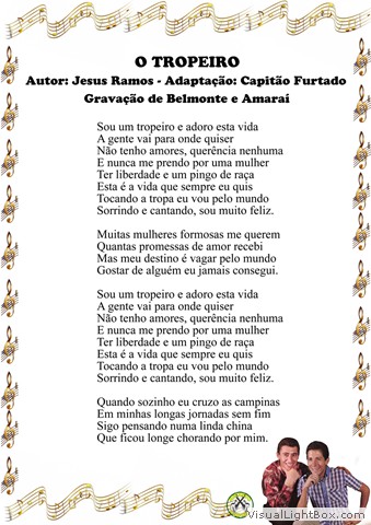 01) Ave Mensageira - Neneco Norton - Versão: Belmonte 02) Gente de Minha Terra - Goiá, Almir e Pereirinha 03) Carreta da Fronteira - Diosnel Chase e M. C. Ocampo - Versão: Palmeira 04) A Voz do Povo é a Voz de Deus - César e Cirus 05) Uma Noite Não - Irene Pintor - Versão: João Borges 06) Mercedita - Ramon S. Rios - Versão: Belmonte 07) O Tropeiro - D. P. - Adaptação: Capitão Furtado 08) Eterna Saudade - Belmonte, Amaraí e Marrequinho 09) Visita à Goiás - Goiá e Sidon Barbosa 10) Tua Ausência - Belmonte e Francisco Lacerda 11) Quatro Estados - José Russo e Zé do Rancho 12) Ao Te Perder - Kennedy e M. Carr - Versão: Luiz de Castro 13) Cavalo Preto Valente - Belmonte e Miltinho 14) Adeus, Mariquita Linda - Marcos A Gimenez - Versão: Francisco Ávila