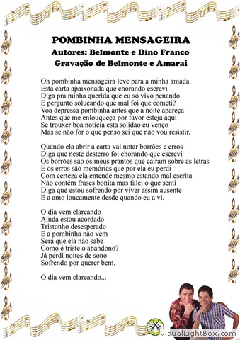 01) Pombinha Mensageira - Belmonte e Juquinha 02) Saudade de Minha Terra - Goiá e Belmonte 03) Lágrimas da Alma - Bony Villaseñor e J. K. Filho 04) Eu Te Amarei Por Toda Vida - Cuco Sanchez - Versão: Miltinho