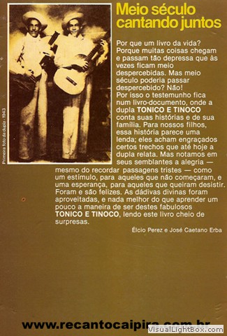 Porque muitas coisas chegam e passam tão depressa que às vezes ficam meio despercebidas. Mas meio século poderia passar despercebido? Não! Por isso o testemunho fica num livro-documento, onde a dupla TONICO E TINOCO conta suas histórias e de sua família. Para nossos filhos, essa história parece uma lenda; eles acham engraçados certos trechos que até hoje a dupla relata. Mas notamos em seus semblantes a alegria – mesmo do recordar passagens tristes – como um estímulo, para aqueles que não começaram, e uma esperança, para aqueles que queiram desistir. Foram e são felizes. As dádivas divinas foram aproveitadas, e nada melhor do que aprender um pouco a maneira de ser destes fabulosos TONICO E TINOCO, lendo este livro cheio de surpresas.
