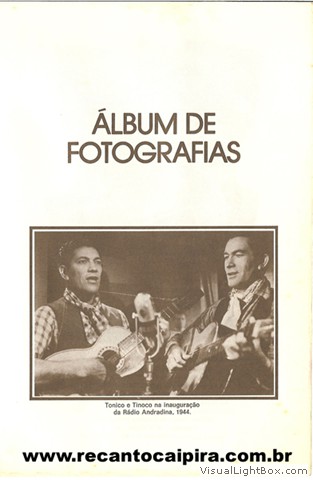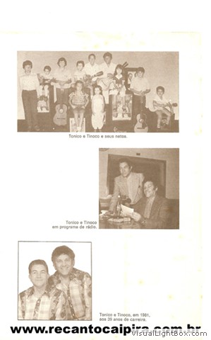 Por isso o testemunho ficará escrito num livro-documento, onde a dupla TONICO E TINOCO conta sua história e de sua família. Para nossos filhos essa história parece uma lenda; eles acham engraçados certos trechos que até hoje a dupla relata. Mas notamos em seus semblantes a alegria – mesmo ao recordar passagens tristes – como um estímulo para aqueles que não começaram, e uma esperança para aqueles que queiram desistir.