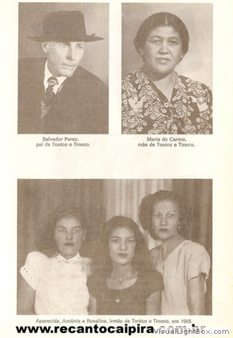 Tonico: - Meu nome (Tonico) é João Salvado Perez, nascido em 2 de março de 1917 na cidade paulista de São Manuel. José Perez, o Tinoco, nasceu em 19 de novembro de 1920.