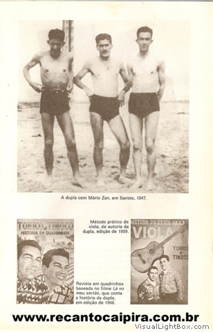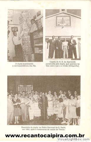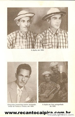 Tonico: - Conhecemos Antônio Paulino Vieira e sua família quando, certa vez, ele veio nos visitar no programa que fazíamos na Rádio Difusora. Na ocasião ele nos contratou para um show em um cinema de Itajobi, onde também conseguimos outros contratos para cantarmos em Ibirá, Novo Horizonte e Catanduva, cidades da mesma região.