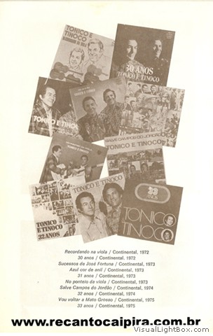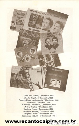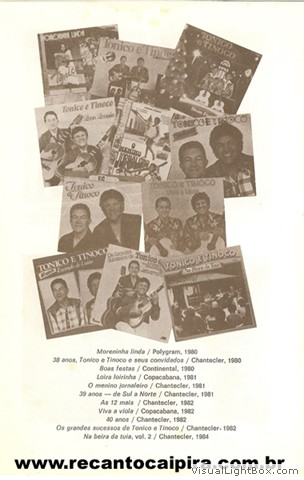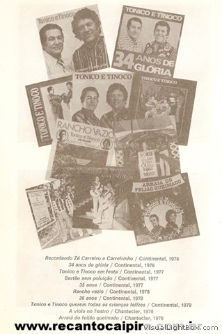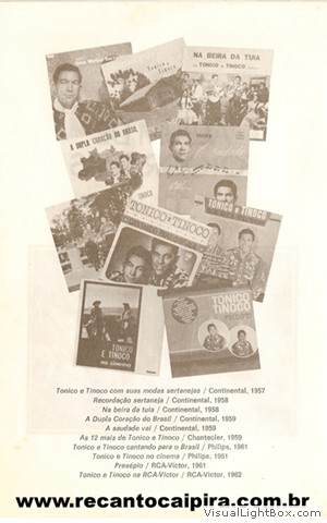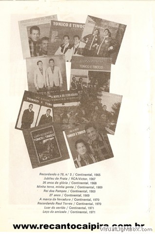 Tonico: - Um dia, conversando com o Tinoco, resolvemos fazer um concurso para ver se aparecia uma dupla que se assemelhasse à nossa. O prêmio seria o contrato na Rádio e na Continental para gravar discos.